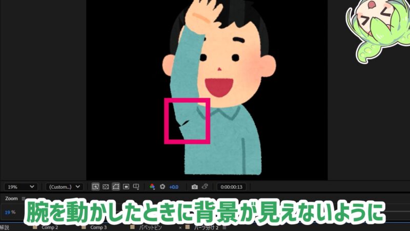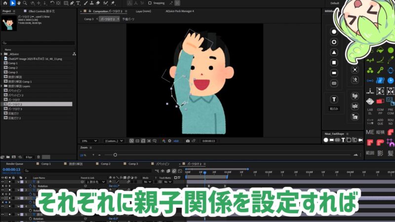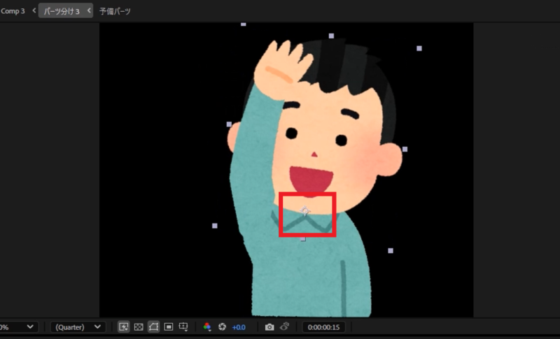 パーツ分けしたイラストをAEに読み込み、アンカーポイントを設定していきます。