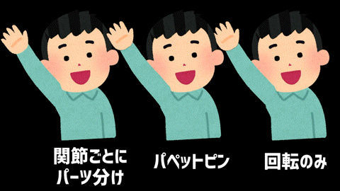 今回の講座では自然な動きにしたいので、関節ごとにパーツ分けをして回転で動かす方法を採用します。